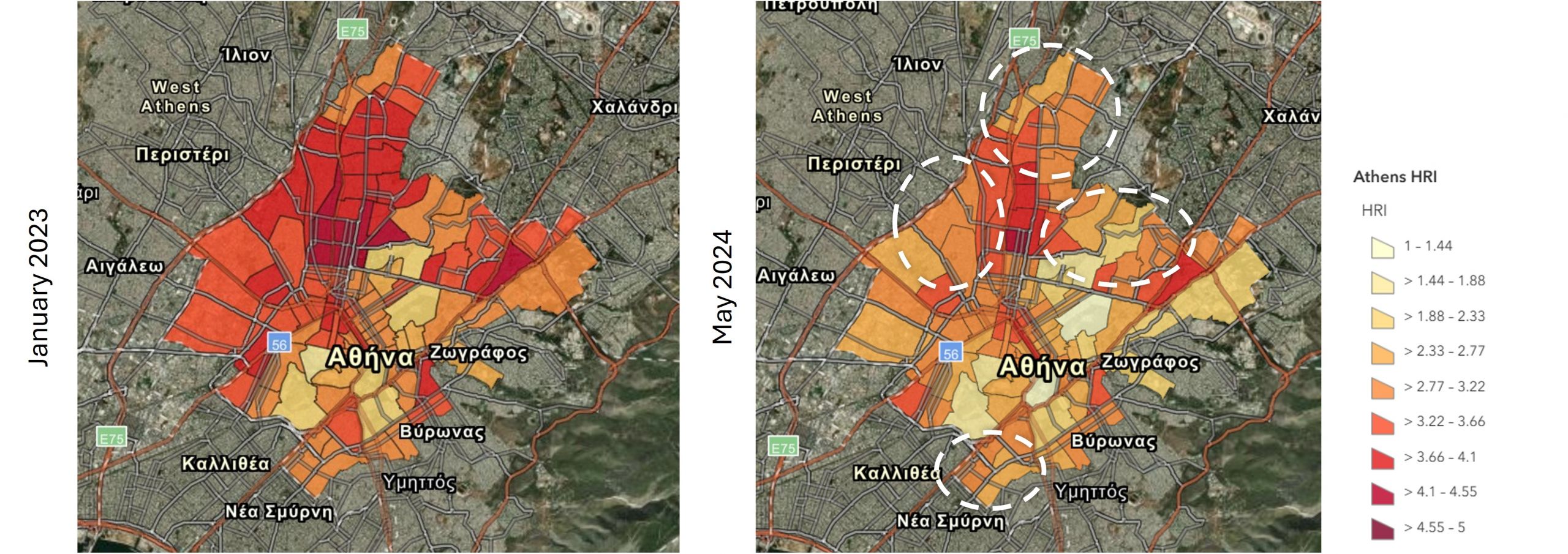 The Athens Heat Risk digital map identifies areas of highest thermal stress, supporting both planning and citizen awareness.