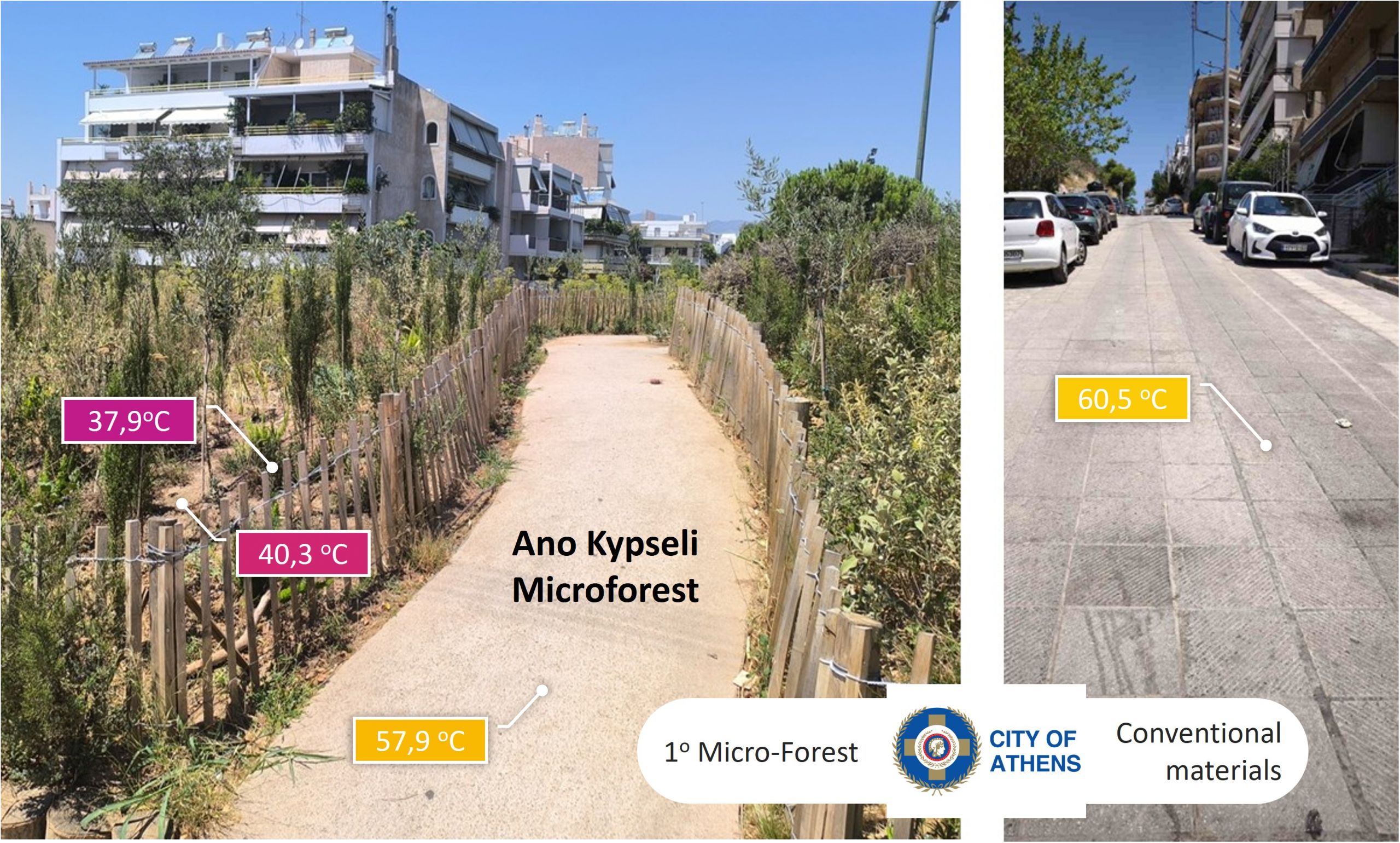 • Ano Kypseli Microforest: A former parking lot transformed into a dense microforest now registers surface temperatures of 37-40 °C; a dramatic improvement compared to the 60 °C recorded when it was a parking area.